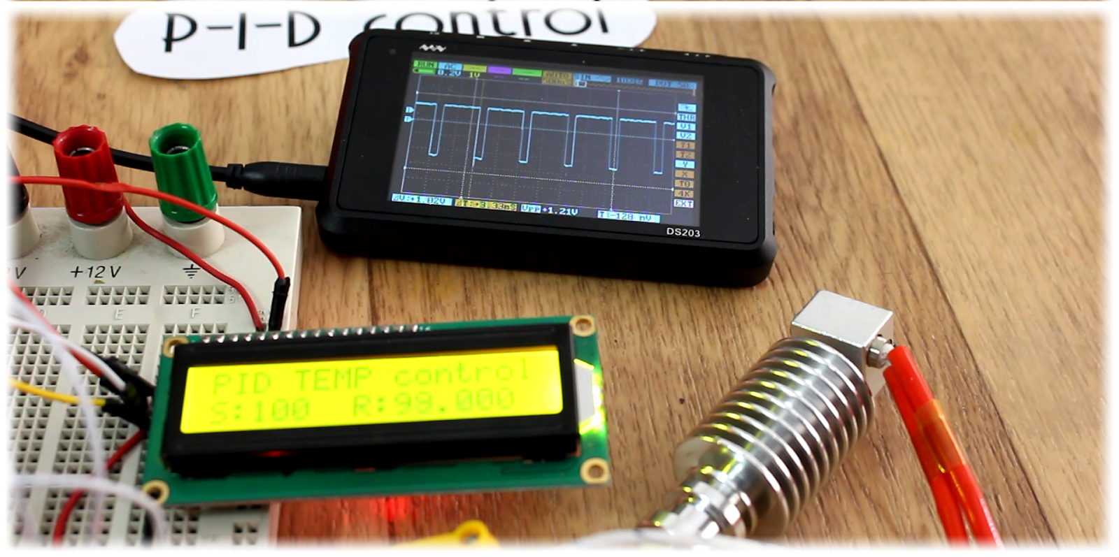 Initially, the system does not reach the desired value, because the pulse has a small width due to using the BJT to activate the N channel gate, so the mosque is activated with a lower quality in this field. Once it reaches the set quality it is used to maintain temperature and almost wambble begins. As you can see, if I try to cool the heating element by air in this air with the tube, the PWM signal width is low in keeping the same value. So, the control works.The default value is now 0 degrees. Press the Rotary Encoder Set button to enter or leave it to the left to decrease the temperature value. Again press the Set button and now you can set P constant for PID control. Press again and I select the value. Finally, press the button again and select D value. Now press the button and exit the menu and save the new settings. I put it at 100 degrees.